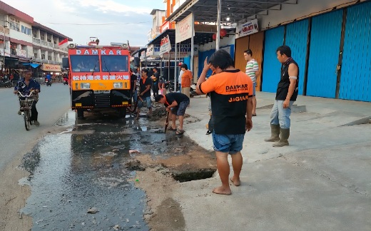 SUI PINYUH — Genangan air yang bikin resah warga di simpang Jalan Raya Sungai Pinyuh–Anjongan akhirnya ditangani. Tim Damkar Jaguar Sungai Pinyuh turun tangan melakukan normalisasi saluran drainase di depan deretan ruko baru bekas kebakaran. Camat Sungai Pinyuh, Ibrahim Mahras, turut hadir memantau langsung jalannya pembersihan, Selasa (10/6).