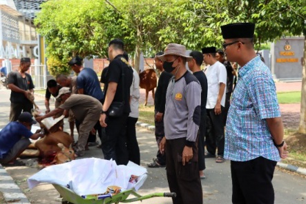 AKBP Jonathan David Harianthono, hadir langsung dan menyerahkan hewan kurban secara simbolis kepada panitia. Suasana terasa khidmat saat doa dipanjatkan oleh Ustadz Wandika. Beberapa warga tampak hadir menyaksikan, sebagian lainnya menunggu dengan harap.